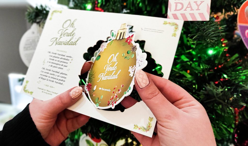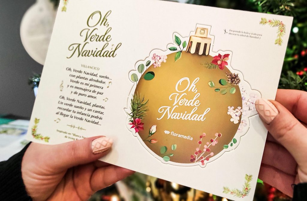 Tanto en 2020 como en 2021 los españoles han reconectado con la naturaleza, con el color verde, llenando sus hogares de plantas y flores ornamentales. Es por ello que hemos querido celebrar una Navidad de color Verde con un villancico muy especial y un pequeño obsequio en forma de tarjeta navideña diseñada por nuestro equipo de la cual se extrae una bola de Navidad de cartón que pueden colgar en sus abetos: